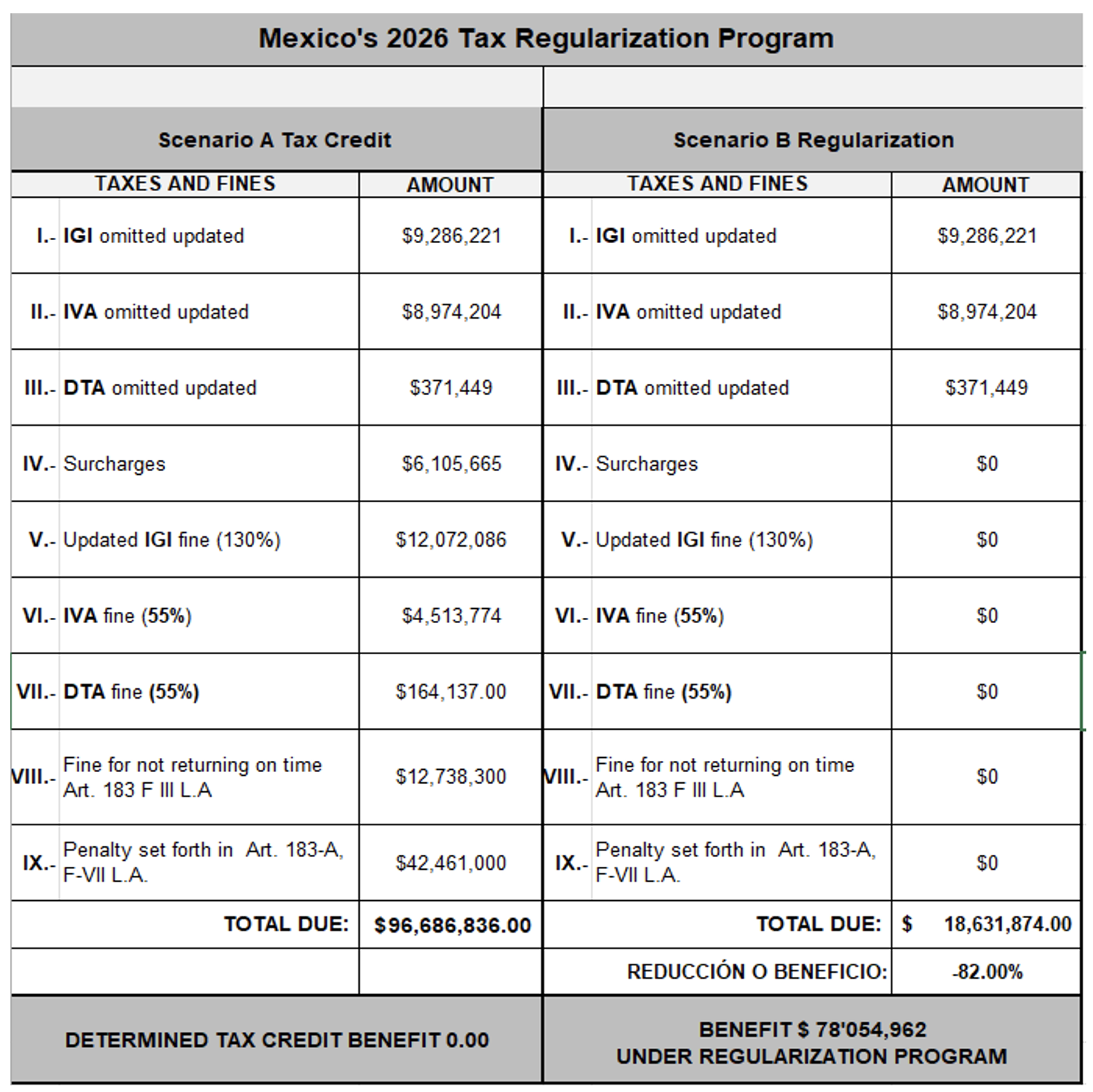 Consider an IMMEX company that failed to return temporarily imported goods on time and was discovered by SAT during an audit. Scenario A shows the calculation if the authorities issue a tax credit, while scenario B shows the benefit if Mexico’s 2026 Tax Regularization Program is applied.